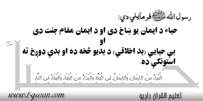ژباړه: حیاء د ایمان یو ښاخ دی او د ایمان مقام جنت دی او بې حیايي (بد اخلاقي) د بدیو څخه ده او بدي دوږخ ته استونکې ده. رواه احمد والترمذي.