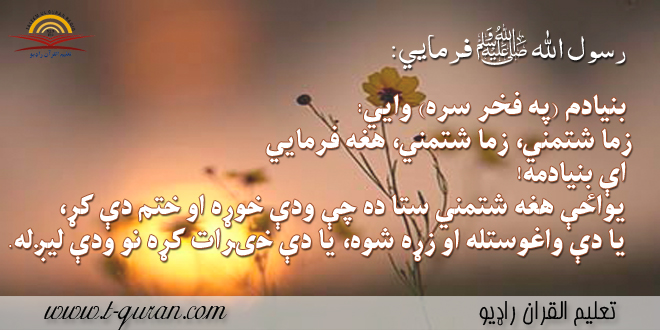 بنيادم (په فخر سره) وایي: زما شتمني، زما شتمني، هغه فرمایي اې بنیادمه! یواځې هغه شتمني ستا ده چې ودې خوړه او ختم دې کړ، یا دې واغوستله او زړه شوه، یا دې خیرات کړه نو ودې لیږله.