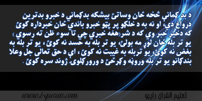 ترجمه : د بد ګمانې څخه ځان وساتئ بيشكه بدګماني د خبرو بدترين درواغ دي، او نه به د خلګو پر پټو خبرو باندي ځان خبرداره كوئ كه دخير خبر وي كه د شر(هغه خبري چي تا سوء ظن ته رسوي ) يو تر بله ځان لوړ مه بولئ، يو تر بله به حسد نه كوئ ، يو تر بله به بغض نه كوئ، يو تربله به غيبت نه كوئ ، اې د حق تعالى جل وعلا بندګانو يو تر بله وروڼه وګرځئ د ورورګلوۍ ژوند سره كوئ .