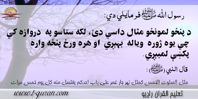 عن جابر (رض)  قال قال رسول الله مثل الصلوت الخمس کمثل نهر جار غمر على باب احدکم يغتسل منه کل يوم خمس مرات. ژباړه : د حضرت جابر (رض) څخه روايت دئ، چي نبي (ص) وفرمايل: د پنځو لمونځو مثال داسي دئ، لکه ستاسو په  دروازه کي چي يوه ژوره  وياله  بهېږي  او هره ورځ پنځه واره پکښې لمبېږي.