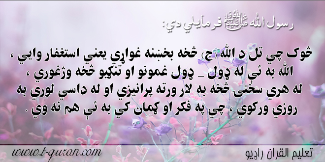 رسول الله صلى الله عليه وسلم وايي : څوک چي تل د الله جل جلاله څخه بخښنه غواړي یعني استغفار وايي ، الله به ئې له ډول _ ډول غمونو او تنګسو څخه وژغوري ، له هري سختۍ څخه به لار ورته پرانيزي او له داسي لوري به روزي ورکوي ، چي په فکر او ګمان کي به ئې هم نه وي .