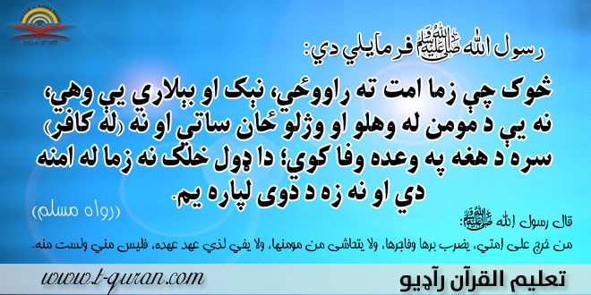 څوک چې زما امت ته راووځي، نېک او بېلاري یې وهي، نه یې د مومن له وهلو او وژلو ځان ساتي او نه (له کافر) سره د هغه په وعده وفا کوي؛ دا ډول خلک نه زما له آمنه دي او نه زه د دوی لپاره یم.