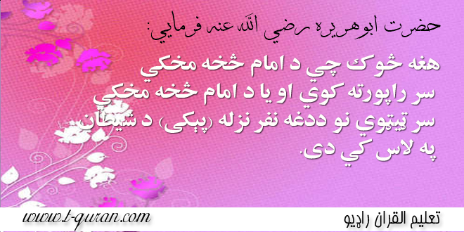 حضرت ابوهریره رضي الله عنه فرمايي: هغه څوک چي د امام څخه مخکي سر راپورته کوي او یا د امام څخه مخکي سر ټيټوي نو ددغه نفر نزله (پېکی) د شیطان په لاس کي دی. رواه مالک.