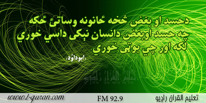 دحسد او بغض څخه ځانونه وساتی ځکه چه حسد اوبغض دانسان نيکی داسی خوری لکه اور چی بوټی خوری.