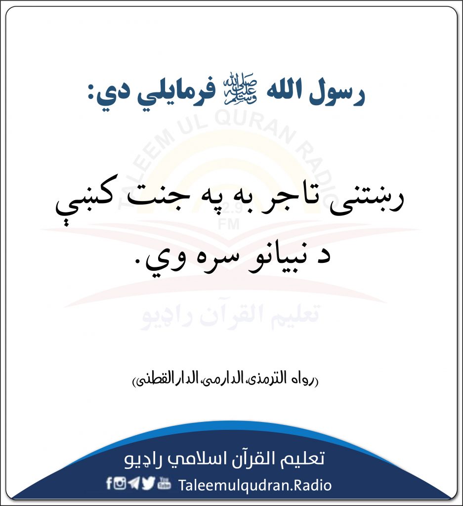 رښتنی تاجر به په جنت کښې دنبيانو سره وي. (رواه الترمذی،الدارمی،الدارالقطنی)