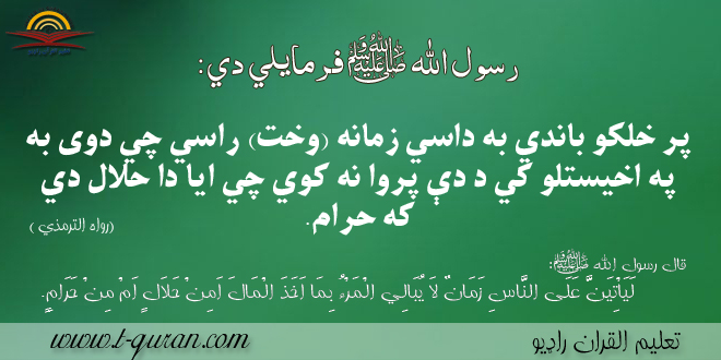 ترجمه: د حضرت ابو هريرة (رض) څخه روايت دئ، چي رسول الله (ص) وفرمايل، چي: پر خلکو باندي به داسي زمانه (وخت) راسي چي دوی به په اخيستلو کي د دې پروا نه کوي چي آيا دا حلال دي که حرام.