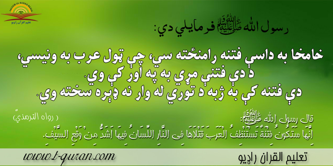 خامخا به داسې فتنه رامنځته شي، چې ټول عرب به ونیسي، د دې فتنې مړي به په اور کې وي. دې فتنه کې به ژبه د توري له وار نه ډېره سخته وي.
