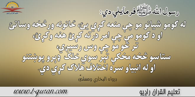 له کومو شیانو مو چې منعه کړي یئ، ځانونه ورنه وساتئ او د کومو مې چې امر درته کړئ هغه وکړئ، تر څو مو چې وس رسیږي، ستاسو نه مخکې تېر شوي خلک ډېرو پوښتنو او له انبیاو سره اختلاف هلاک کړي دي.