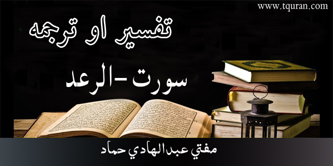 الـمر تِلْكَ آيَاتُ الْكِتَابِ وَالَّذِي أُنْزِلَ إِلَيْكَ مِنْ رَبِّكَ الْحَقُّ وَلَكِنَّ أَكْثَرَ النَّاسِ لَا يُؤْمِنُونَ (1) اللَّهُ الَّذِي رَفَعَ السَّمَوَاتِ بِغَيْرِ عَمَدٍ تَرَوْنَهَا ثُمَّ اسْتَوَى عَلَى الْعَرْشِ وَسَخَّرَ الشَّمْسَ وَالْقَمَرَ كُلٌّ يَجْرِي لِأَجَلٍ مُسَمًّى يُدَبِّرُ الْأَمْرَ يُفَصِّلُ الْآيَاتِ لَعَلَّكُمْ بِلِقَاءِ رَبِّكُمْ تُوقِنُونَ (2) وَهُوَ الَّذِي مَدَّ الْأَرْضَ وَجَعَلَ فِيهَا رَوَاسِيَ وَأَنْهَارًا وَمِنْ كُلِّ الثَّمَرَاتِ جَعَلَ فِيهَا زَوْجَيْنِ اثْنَيْنِ يُغْشِي اللَّيْلَ النَّهَارَ إِنَّ فِي ذَلِكَ لَآيَاتٍ لِقَوْمٍ يَتَفَكَّرُونَ (3) وَفِي الْأَرْضِ قِطَعٌ مُتَجَاوِرَاتٌ وَجَنَّاتٌ مِنْ أَعْنَابٍ وَزَرْعٌ وَنَخِيلٌ صِنْوَانٌ وَغَيْرُ صِنْوَانٍ يُسْقَى بِمَاءٍ وَاحِدٍ وَنُفَضِّلُ بَعْضَهَا عَلَى بَعْضٍ فِي الْأُكُلِ إِنَّ فِي ذَلِكَ لَآيَاتٍ لِقَوْمٍ يَعْقِلُونَ (4) وَإِنْ تَعْجَبْ فَعَجَبٌ قَوْلُهُمْ أَئِذَا كُنَّا تُرَابًا أَئِنَّا لَفِي خَلْقٍ جَدِيدٍ أُولَئِكَ الَّذِينَ كَفَرُوا بِرَبِّهِمْ وَأُولَئِكَ الْأَغْلَالُ فِي أَعْنَاقِهِمْ وَأُولَئِكَ أَصْحَابُ النَّارِ هُمْ فِيهَا خَالِدُونَ (5) وَيَسْتَعْجِلُونَكَ بِالسَّيِّئَةِ قَبْلَ الْحَسَنَةِ وَقَدْ خَلَتْ مِنْ قَبْلِهِمُ الْمَثُلَاتُ وَإِنَّ رَبَّكَ لَذُو مَغْفِرَةٍ لِلنَّاسِ عَلَى ظُلْمِهِمْ وَإِنَّ رَبَّكَ لَشَدِيدُ الْعِقَابِ (6)