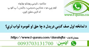 د لمانځه اول صف کښې دريدل د چا حق دی او څومره ثواب لري؟ مسلسله شمېره: ۷ جواب ویونکی : مفتي عبدالهادي حماد (حفظه الله) کښته کولو لپاره همدا پیوند کلیک کړئ