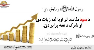 سود د شرک په ډول دئ وَ عَنْهُ اَنَّ النَّبِی صَلَى اللهُ عَلَيْهِ وَسَلَّمْ قَالَ: اَلرِّبَا بِضْعٌ وَّسَبْعُوْنَ بَاباً وَالشِّرْکُ مِثْلُ ذَلِکَ)۲(. ترجمه: او د هغه (عبدالله ابن مسعود (رض) روايت دئ، چي: نبي کريم(ص) وفرمايل، چي: د سود مفاسد تر اويا څه زيات دي او شرک د هغه برابر …