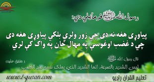 نور لوستلعدل په نبوي احادیثو کې رسول الله صلي الله عليه وسلم وايې : پیاوړی هغه نه دی چي زور ولري بلکي پیاوړی هغه دی چې د غضب اوغوسې په مهال ځان په واک کې لري . ليس الشديد بالصرعة، إنما الشديد الذي يملك نفسه عند الغضب ( متفق علیه)