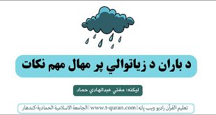 لیکنه: مفتي عبدالهادي حماد | تعلیم القرآن اسلامي راډیو ویب پاڼه لطفا لاندي خبري په نظر کي ونیسئ او نور هم په خبر کړئ: ۱: لاندي دعا ووایاست: اللَّهُمَّ حَوَالَيْنَا وَلاَ عَلَيْنَا ، اللَّهُمَّ عَلَى الآكَامِ وَالظِّرَابِ ، وَبُطُونِ الأَوْدِيَةِ ، وَمَنَابِتِ الشَّجَرِ. ۲: د باران د درېدو خواست مه …